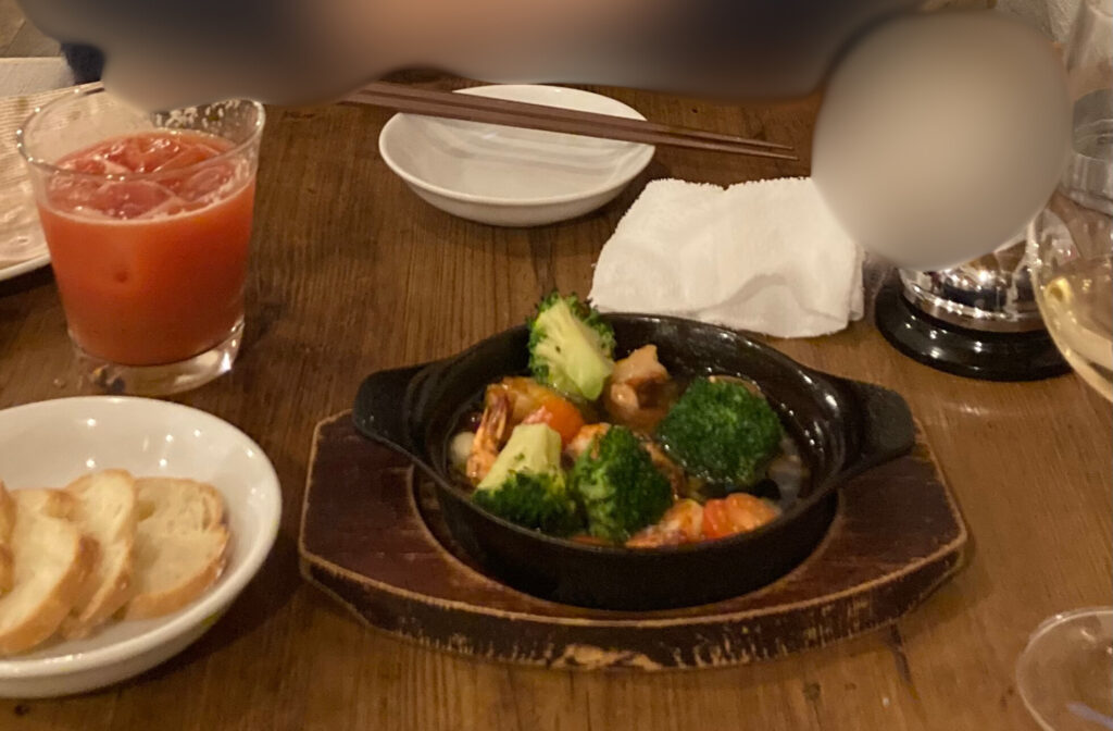 アヒージョは安定の美味しさです。私たちはよくバケットおかわりしてにんにくの香りたっぷりのオイルまでしっかり楽しみます(筆者撮影)