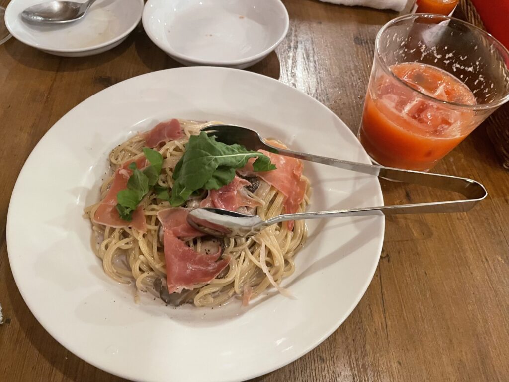 最初から気になってた本日のパスタ(生ハムとゴルゴンゾーラのきのこクリームパスタ)です。頼んで大正解でした。またきた時は食べたい!(筆者撮影)