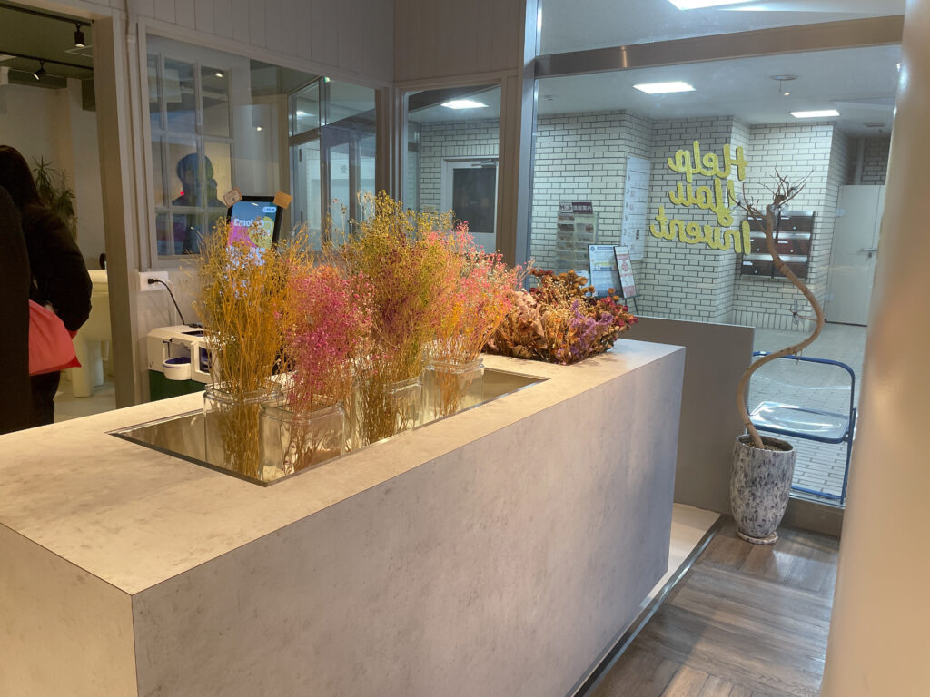 エントランス近くにある台です。なんかおしゃれ感ありますよね?小窓から店員さんがこちらの様子を確認できるようになってます(筆者撮影)