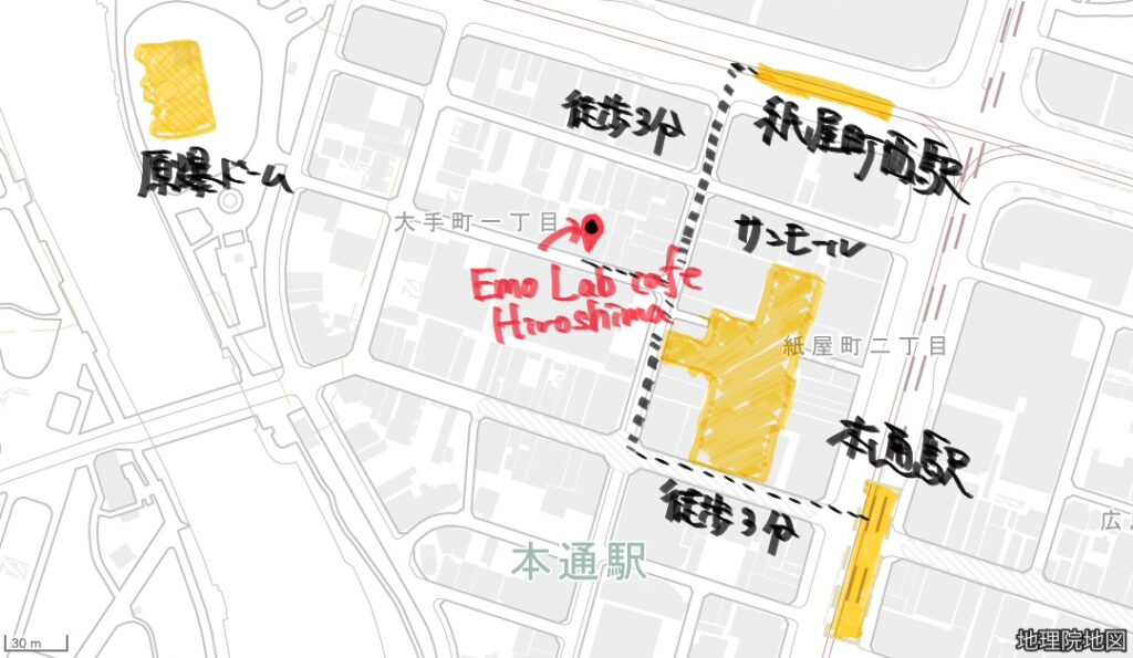 Emo Lab cafe Hiroshimaさんは、原爆ドームと本通りの近くの「中区大手町」にあり、