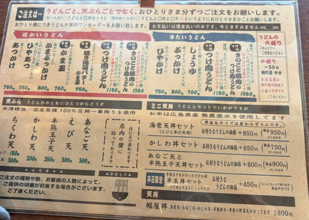 メニューは、温かいうどんと冷たいうどん、天ぷらがメインでした。