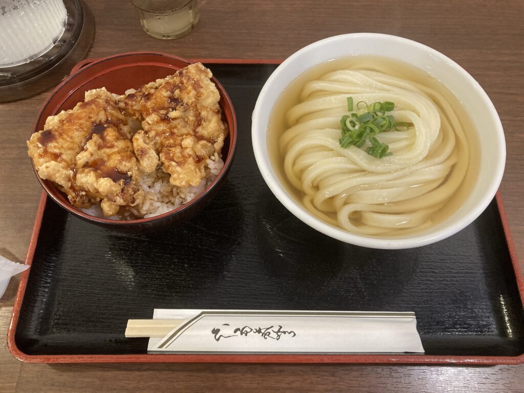私は、温かいうどんの「ひやあつ」のかしわ丼セットを、奥さんはつけ肉うどんを注文しました。