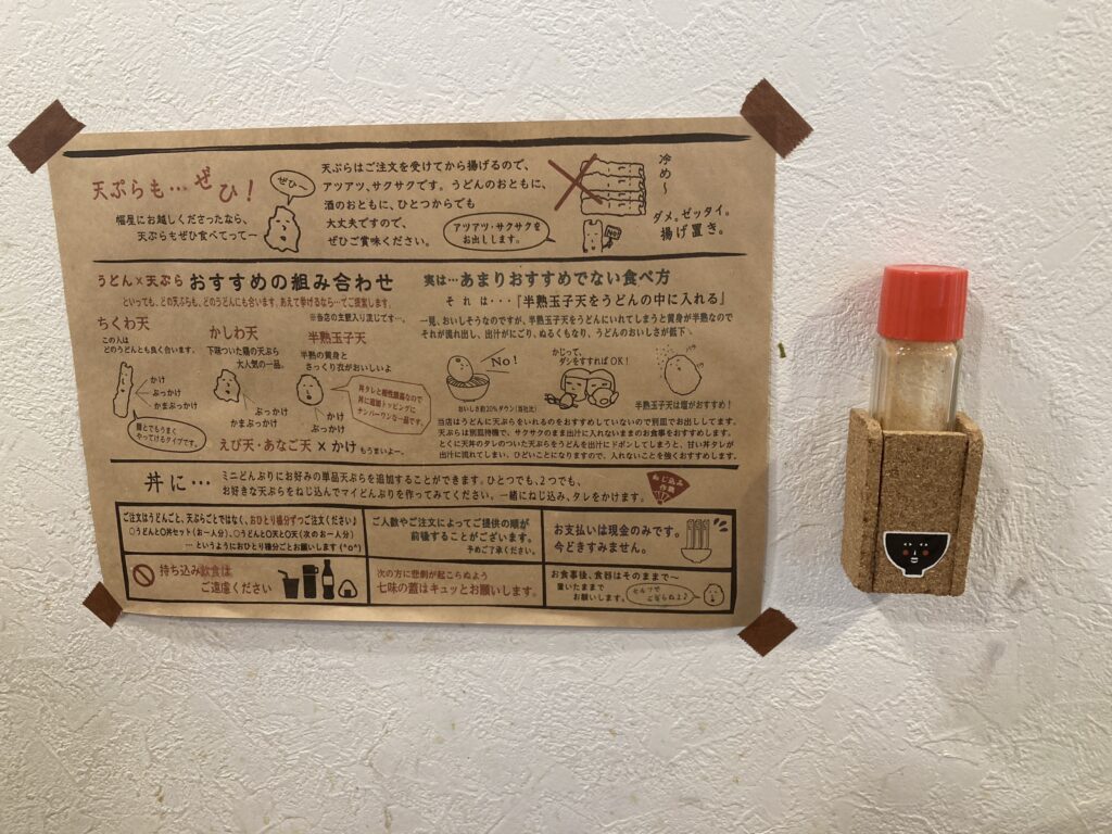 また、各席には、うどん注文時の注意事項が描かれている紙が貼ってあります。